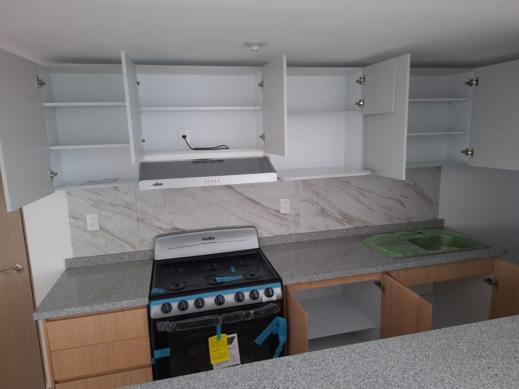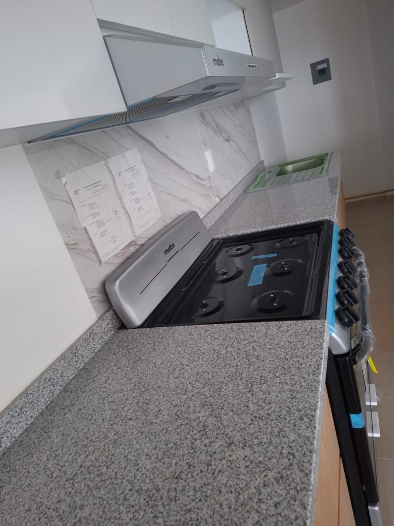 La cocina cuenta con una distribución con barra desayunador, lo que permite integrar el área de cocina con el comedor o sala, creando un espacio social abierto y versátil. Los materiales seleccionados fueron cuidadosamente elegidos para brindar durabilidad y fácil mantenimiento, manteniendo al mismo tiempo una estética sofisticada: